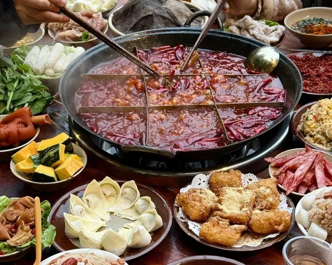 The food is the real reason to come. Chongqing hotpot is a bubbling cauldron of numbing Sichuan peppercorns and chilli oil so red it glows. You can order whatever ingredients you like, but try the local favourites: mao du (tripe), ya chang (duck intestines), and huang hou (beef throat). The region also created jianghu cai, "river and lake cuisine", a style that emerged from dock workers. Dishes like Geleshan spicy chicken and mao xue wang (duck blood, tripe, eel, and ham in spicy broth) define this bold cooking style.