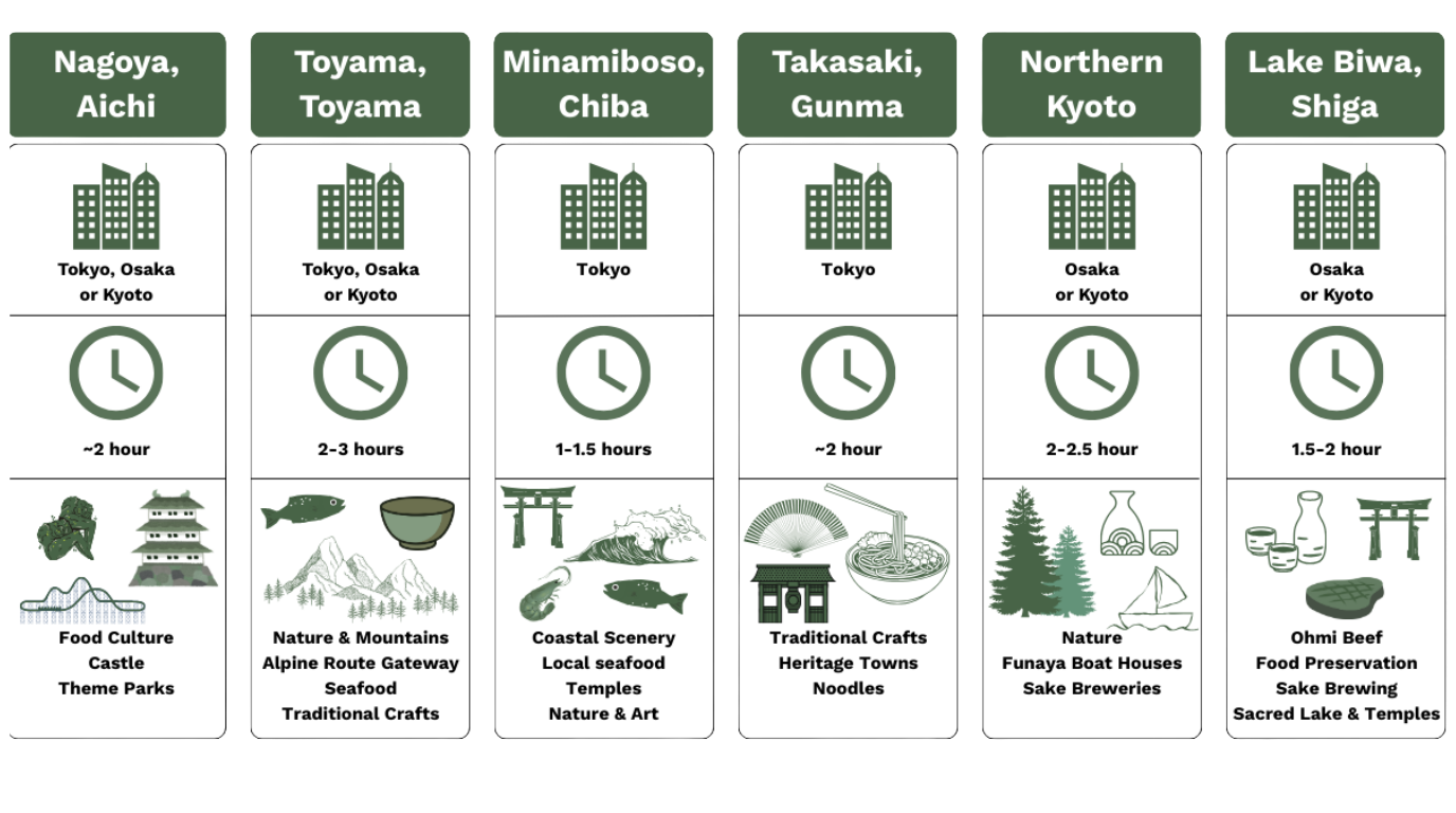 Yes. All six destinations are easy to reach by public transport from Tokyo, Kyoto or Osaka, and none require advanced Japanese language skills to navigate. They're ideal for first-timers who want to see more than the Golden Route without the complexity of planning a deeper regional trip.
